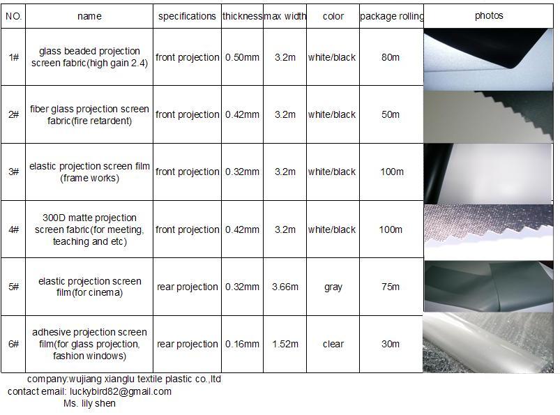 | Explanation£º FRONT matte projection Screen Fabric(PVC matte white laminated with fabric core),perfect flat surface without any curling edge most competitive price and steady good quality, we are factory. free samples vailable, small order allowed we can promise you good quality, timely delivery, competitive price we are honest dealer High Quality FRONT matte projection Screen Fabric(coating style) 1.8m,2.2m,2.5m,2.8m.3.0m,3.2m,samples available, thickness:0.40mm,weight:400gsm, front side matte white, rear side black color. package:100m per roll the projection screen film is very popular as screen for teaching, meeting, advertising, TV studio, conference rooms, exhibition, home theater, entertainment and other fields for display FRONT PROJECTION FABRIC 1) PVC matt projection screen fabric is made of polyvinyl chloride with 300D cloth core OR fiber glass core 2) We can produce white screen and grey screen for front projection, also rear screen film 3) Max. width: 1.4m,1.6m,1.85m, 2.1m, 2.25m, 2.5m, 2.8m, 3.2m,5.0m seamless 4)quality: Perfect flat surface, no ripples and edge-curling 5) Anti-UV, anti-fire, RoHS requirements, according to customers' needs Outer packing: Rolling with Kraft paper and 8mm thickness hard paper tubes outside, or wooden case if you required. |